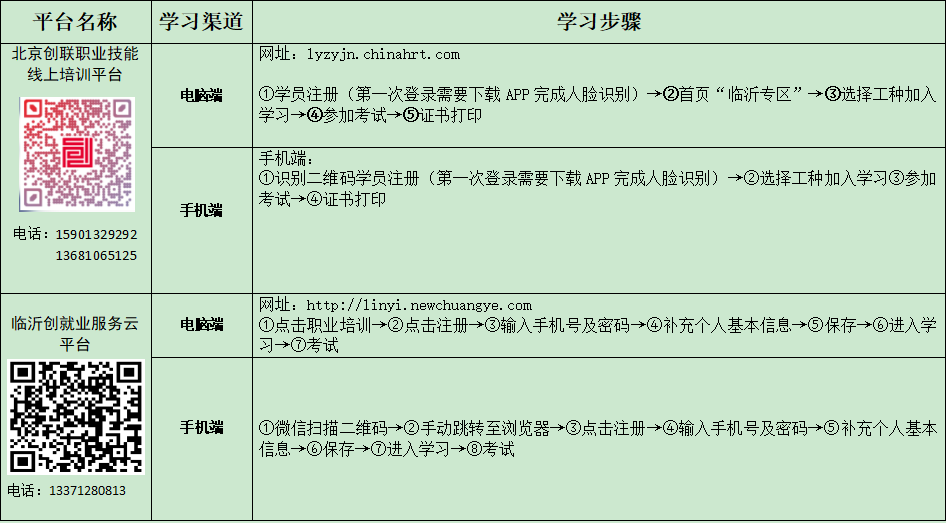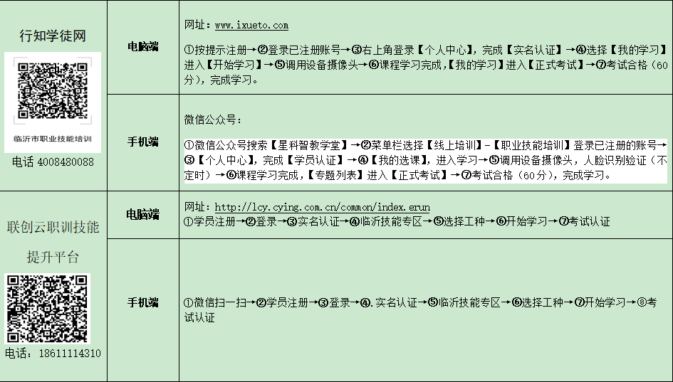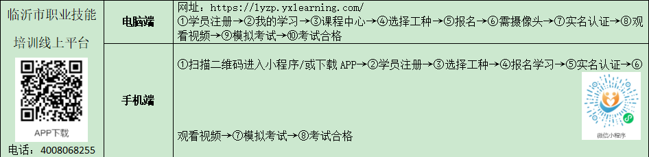 为有效应对疫情,方便劳动者提高技能,按照“政府鼓励 平台自愿”的原则,现将通过临沂市人力资源和社会保障局遴选备案,在疫情防控期间向社会个人免费开放部分课程的互联网平台进行公布。 一、谁可以参加免费线上培训?我市劳动年龄内(16周岁-60周岁)农村转移劳动力、高校在校生(含职业院校、技工院校)、企业职工、退役士兵、残疾人、登记失业人员、灵活就业人员、脱贫享受政策人员等城乡各类劳动者。 二、如何学习?劳动者在所公布的平台目录中任选其一,按平台提示进行实名制注册,提交个人相关信息后,即可选择适合本人的工种进行免费学习。 三、如何与线下培训相结合?在严格遵守属地疫情防控规定的前提下,鼓励完成线上培训的学员,及时到线下培训机构继续参加同一工种的实操培训。学员线上学习时长可累计折算,符合我市补贴性职业技能培训政策的,按规定给予职业培训补贴。